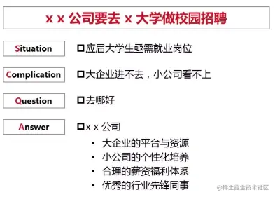 整个结构是通过描述当事者的现实状态,然后带出冲突和核心问题,通过结构化分析以提供更为明智的解决方案。以校园招聘SCQA分析为例: