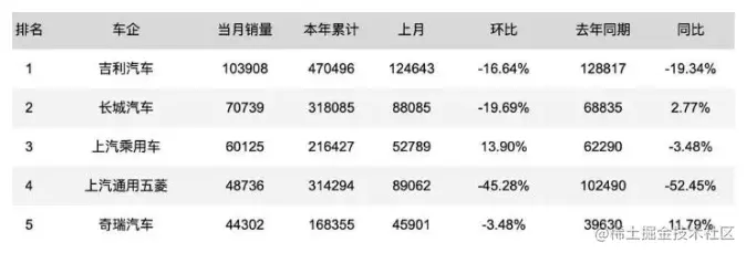 举例:各车企销售表现