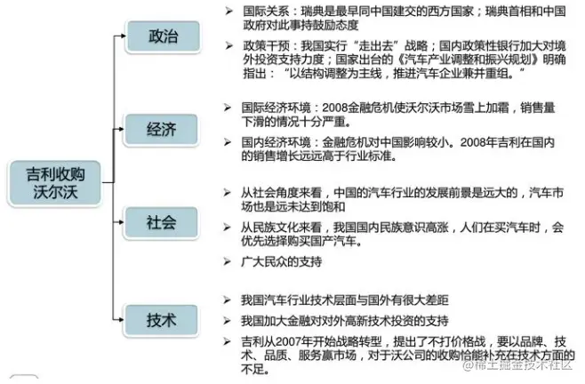 PEST分析是指宏观环境的分析,宏观环境是指影响一切行业或企业的各种宏观力量。P是政治(Politics),E是经济(Economy),S是社会(Society),T是技术(Technology)。通常是战略咨询顾问用来帮助企业检阅其外部宏观环境的一种方法,以吉利收购沃尔沃为例: