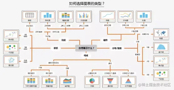 图表的选择,不只是关注图表的样式,而关键在于关注数据情况及图表展示的功能。可以通过数据展示的功能(构成、比较、趋势、分布及联系)进行图表选择,如下所示: