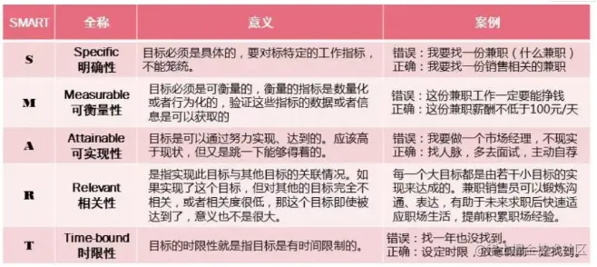 SMART法是一种目标管理方法,即对目标的S(Specific)明确性,M(Measurable)可衡量性,A(Attainable)可实现性,R(Relevant)相关性,T(Time-based)时限性。