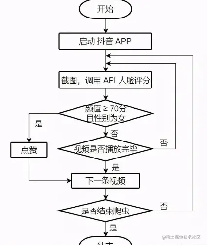 如果画面中中没有出现人脸,或者性别为男,或者颜值不足70,则继续截图检测,直到视频播放结束,或者找到满足条件的人脸为止,然后上滑播放下一条视频。为了尽可能地不错过有漂亮小姐姐的抖音,每条视频中会截取 4 - 5 张图片进行检测,只要有一张截图中有高颜值的小姐姐,那么我们就对这个视频进行点赞。如果这样都检测不出来,只能说小姐姐藏得太深,或者漂亮的不够明显了