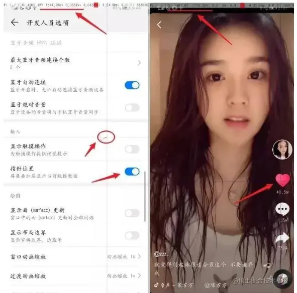 修改坐标的方法我也大概说一下,在你手机的设置中,找到开发人员选项,然后将指针位置这个打开,然后你就可以看到你点击到屏幕的位置了,顶部也会显示你点击的位置坐标。