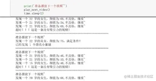 print("打开抖音~") start_my_app(package_name, activity_name) time.sleep(5) print("开始播放视频~") find_girl_num = 0 # 对当前视频截图去人脸识别 while True: # 开始识别的时间 recognite_time_start = datetime.datetime.now() # 识别次数 recognite_count = 1 # 循环地去刷抖音 while True: # 获取截图 screen_name = get_screen_shot_part_img('images/temp%d.jpg' % recognite_count) # 人脸识别 recognite_result = analysis_face(parse_face_pic(screen_name, TYPE_IMAGE_LOCAL, access_token)) recognite_count += 1 # 第n次识别结束后的时间 recognite_time_end = datetime.datetime.now() # 这是一个美女 if recognite_result: find_girl_num += 1 save_video_met(screen_name, find_girl_num) print("已经发现 %d 个漂亮小姐姐" % find_girl_num) break else: if (recognite_time_end - recognite_time_start).seconds < RECOGNITE_TOTAL_TIME: continue else: print('超时!!!这是一条没有吸引力的视频!') # 跳出里层循环 break # 删除临时文件 shutil.rmtree('./images') time.sleep(0.05) os.mkdir('./images') # 播放下一条视频 print('==' * 30) time.sleep(2) print('准备播放下一个视频~') play_next_video() time.sleep(2)```