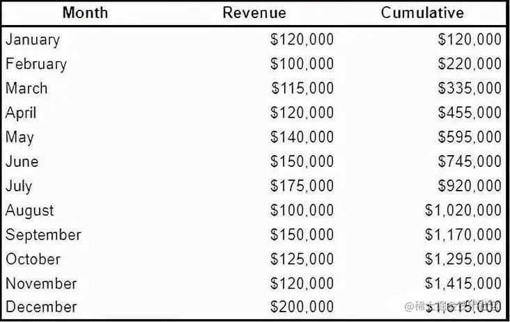 , SUM(Revenue) OVER (ORDER BY Month) AS Cumulative