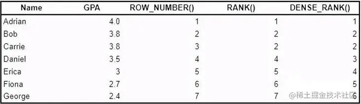 dense_rank()类似于等级(),除了重复等级后没有间隙。请注意,使用dense_rank(),Daniel排名第3,而不是第4位()。