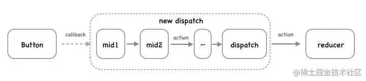 applyMiddleware 是用来改造 store 自带的 dispatch 方法。action 发生后,先给中间件处理,最后再dispatch一个action交给reducer去改变状态