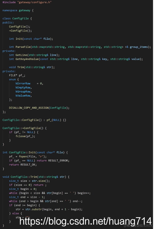 kEmptyRow, kGroupRow, kValueRow, }; DISALLOW_COPY_AND_ASSIGN(ConfigFile);};ConfigFile::ConfigFile() : pf_(NULL) {}ConfigFile::~ConfigFile() { if (pf_ != NULL) {