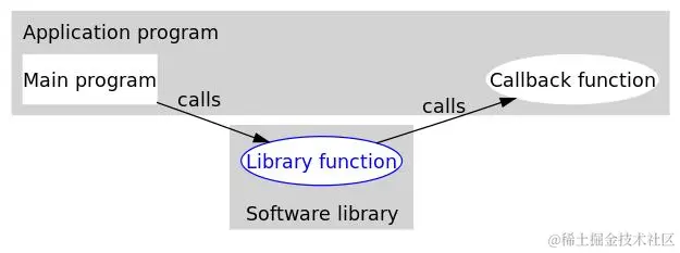 很多朋友可能会想,为什么不像普通函数调用那样,在回调的地方直接写函数的名字呢?这样不也可以吗?为什么非得用回调函数呢?有这个想法很好,因为在网上看到解析回调函数的很多例子,其实完全可以用普通函数调用来实现的。要回答这个问题,我们先来了解一下回到函数的好处和作用,那就是解耦,对,就是这么简单的答案,就是因为这个特点,普通函数代替不了回调函数。所以,在我眼里,这才是回调函数最大的特点。来看看维基百科上面我觉得画得很好的一张图片。