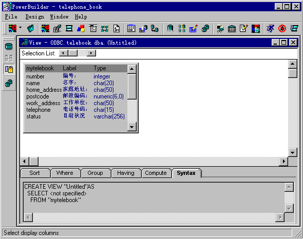 单击PAINTERBAR工具条上的RETURN画板,弹出SAVE VIEW DEFINITION对话框,为新创建的视图起个名字,这里不妨给它起名为MYTELEVIEW,然后单击CREATE按钮,本地数据库管理系统SYBASE SQL ANYWHERE就根据SQL语句自动生成视图MYTELEVIEW,创建好的视图显示在数据库窗口中,它有四个字段直接来自表MYTELEBOOK,而字段ADDRESS则来自得到的计算字段。这样一个数据库中的视图就创建好了。