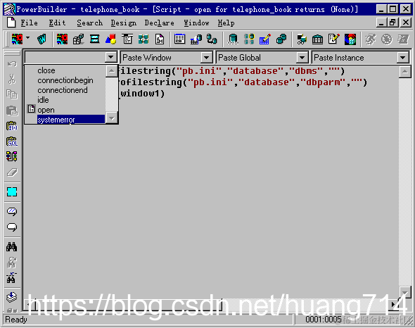 最后介绍一下应用对象的事件。确定应用对象处于打开状态,单击PAINTERBAR工具条上的SCRIPT按钮,在SCRIPT窗口中的第一个下拉列表框中显示的就是应用级事件(图3-6)。下面介绍几个主要的也是最常用的事件,OPEN事件是在应用程序启动后发生,在这个事件的脚本中主要做程序的初始工作,如给全局变量赋值,打开窗口等,CLOSE事件是在应用程序将要关闭的时候发生,这个事件的脚本是用来处理程序关闭前的善后工作,比如和后台数据库断开连接等。如果程序中调用了IDLE函数,那么应用程序运行时用户在一定的时间里没有使用鼠标和键盘就会触发IDLE事件。IDLE事件的脚本用来处理程序长时间没有输入事件的情况,比如可以在脚本中调用屏幕保护程序。SYSTEMERROR事件发生在程序运行出现严重错误的时候,这时不加以处理的话系统会弹出警告对话框指出问题的所在,我们在这个事件中编写脚本的主要目的是防止因为程序运行错误而导致应用程序,甚至整个系统的瘫痪。