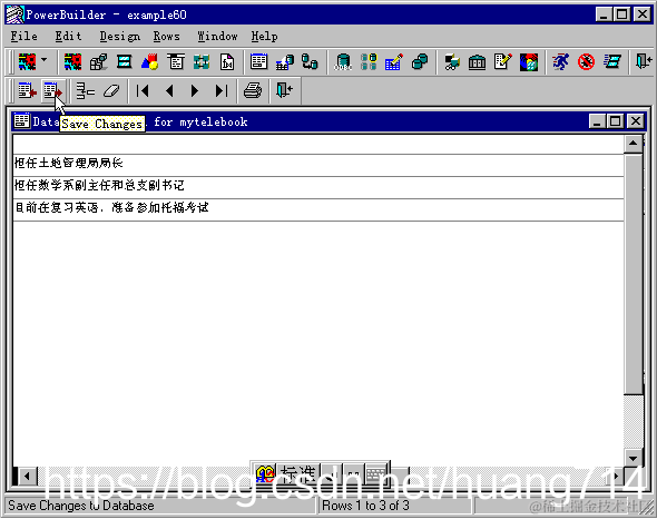 4)再次单击工具条上的INSERT ROW按钮,窗口上又出现一条空记录用来输入数据,用类似的方法依次输入记录的各个字段的值依次为“2”,“李明”,“杭州市浙江大学200号信箱”,“310027”,“浙江大学数学系高等数学教研室”,“0571-7996453”,“担任数学系副主任和总支副书记”,输好第二条记录后用同样的方法再输入第三条记录各项依次为“3”,“张玲”,“宁波市大榭开发区”,“330020”,“宁波市大榭开发区土地管理局”,“0574-5433216”,“担任土地管理局局长”,这样我们就完成了三条记录的录入工作,要注意的是此时输入的记录并没有真正存放到磁盘上去,而是暂时放在缓冲区中,单击工具条上的SAVE CHANGES按钮,这样就把刚才输入的记录真正存放到了磁盘上相应的表中(图2-15)。