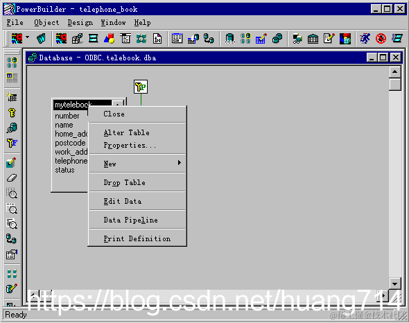 把先前创建的表MYTELEBOOK打开到DATABASE画板中,在表的标题上单击鼠标右键,系统弹出一个菜单(图4-5),菜单的第一项CLOSE是用来关闭这个表。菜单的第二项ALTER TABLE用来对表的定义作出一些修改,选中这个菜单项后系统会弹出ALTER TABLE窗口用来对表的一些属性作修改,在ALTER TABLE窗口中有一些属性,如字段的类型等是灰色显示的,这表示这些属性是不能修改的,否则会影响表中的已有数据和产生其它负面影响。所以系统不允许修改。弹出的菜单的第三项是PROPERTIES菜单项,用来设置表的总体属性。选中这个菜单项,从弹出的对话框的标签可以看出在这里可以定义表的主键,对表的注解,还有表中显示的数据的字体等。弹出菜单的第四项是NEW,它又有两个子菜单项,选中INDEX子菜单项,弹出CREATE INDEX对话框,在这里可以定义表的索引字段和索引的名字,定义索引的好处是可以加快从表中搜索数据的速度,NEW菜单的第二个子菜单项FOREIGN KEY 是用来定义表的外部码,所谓外部码就是当前表的一些字段的组合,这些字段的组合同时又是另一个表的主键。弹出的菜单的第五项DROP TABLE的作用是删除表,建议不要轻易删除一个表,因为删除后就不能恢复了。弹出的菜单的第六项EDIT DATA用来对表中的数据进行操作,例如往表中增加记录等。菜单的第七项是有关数据管道的内容,放在以后介绍。菜单的最后一项PRINT DEFINITION被选中后将在打印机上打印出当前表的定义,打印的格式类似表定义时的格式。