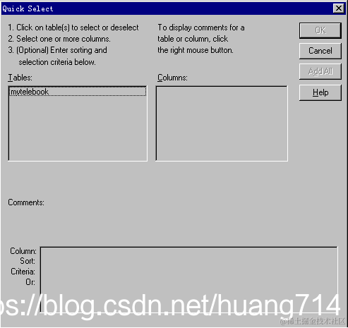 单击OK按钮,系统弹出一个名为QUICK SELECT对话框用于对数据源进行配置(图2-28),在TABLES栏中选中先前创建的表MYTELEBOOK,这时在COLUMNS栏中显示出MYTELEBOOK表中的所有的字段,让我们从这些字段中选择其中的一些,这样做是考虑到用户在大多数时候可能只对表中的某些字段感兴趣,没必要在提供给用户的界面上显示出记录的所有的字段。目前创建的这个数据窗口是用来浏览通讯录的大致情况,所以只选中NUMBER,NAME TELEPHONE三个字段,选好后在对话框的下部显示出这三个字段,在每一个字段的下面又有三个选项,单击NUMBER字段下的SORT选项框,在弹出的下拉框中选择ASCENDING选项,这表示以后在数据窗口中显示数据的时候按编号字段从小到大的顺序显示记录, 以便于查看。其它的选项我们不作改动。