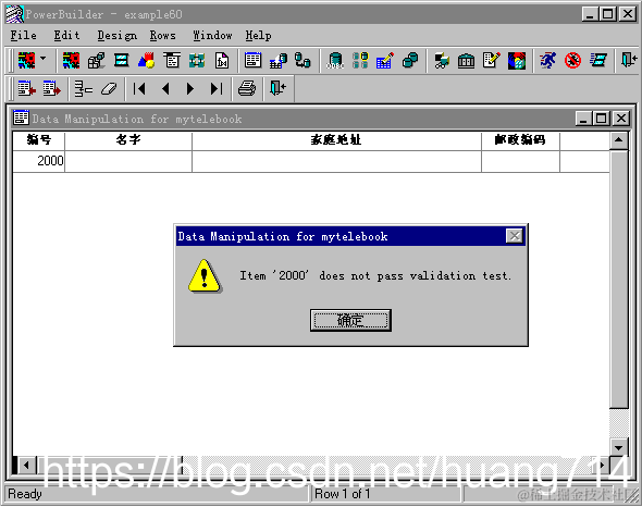 2) 单击工具条上的INSER ROW按钮,窗口上出现一个空行用来输入一条记录,回忆前面我们定义了NUMBER字段的有效性检查规则,要求数据必须在1和1000之间,试着在编号栏中输入2000,然后用鼠标单击其它的字段,这时系统会弹出一个对话框告诉我们刚才输入到编号栏中的数据没有通过有效性检查(图2-14),单击确定后系统把输入焦点仍旧放在编号栏中让我们重新输入一个有效的数据。
