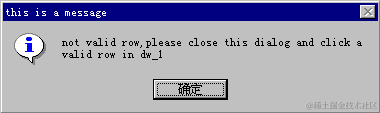 messagebox( "this is a message","not valid row, please close this dialog and click a valid row in dw_1")