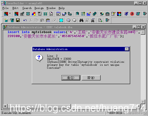 1) 单击工具条上的DB ADMINISTRATION画板按钮,弹出一个标题为DATABASE ADMINISTRATION的可编辑窗口,在这个窗口中可以输入SQL语句来往表中添加记录,不妨在其中输入一条标准的SQL语句为“INSERT INTO MYTELEBOOK VALUES(4,‘王晓’,‘安徽天长市建设东路30号’,239300,‘安徽天长市水泥厂’,‘05507545450’,‘担任水泥厂厂长’);”(图2-16)。