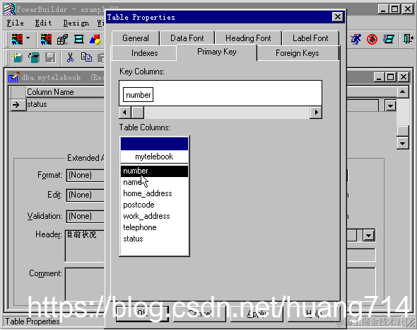 2) 一个表是由很多的字段组成的,接下来开始定义表的各个字段了。注意COLUMN NAME一项,它是用来输入表的字段的名字。这里输入第一个字段的名字为NUMBER,代表一个人在通讯录中的编号。单击DATA TYPE一栏的下拉箭头,从中选择当前字段的数据类型,不妨把NUMBER字段设置为INTEGER整型。这时WIDTH和DEC两项是灰色的,这表示对于整型字段,数据宽度和小数点后的数据宽度两项是不可操作的。单击NULL一栏的下拉列表框,弹出YES 和NO两项,是用来选择当前的字段是否可以取空值,也就是在以后的实际记录中这一个字段是否可以不往里面输入数据,因为通讯录中的每一条记录都必须有一个编号,所以在NULL项中选择NO,表示这个字段不能取空值。注意到对话框的下部还有很多项用来设置当前字段的扩展信息,要指出的是,对于具体的某个字段,只要对确实需要定义和修改的属性进行修改,其它的属性采用系统所给定的缺省值就可以了。此外有些属性我们等到表建立好以后再重新定义。注意扩展属性中的HEADER项,系统已经设置了缺省值NUMBER,这里把它修改为“编号”,同样地把LABEL项中的缺省值修改为“编号”,上面定义的这两项是设置这个表将来通过数据窗口等途径显示出来时的字段题头和标签。这样就定义好了NUMBER字段的一些基本属性(图2-6)。