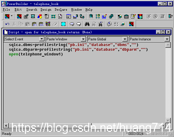脚本的第一条语句的意思是用刚才介绍的系统缺省的事物对象SQLCA联结数据库。第二行脚本的意思是告诉数据窗口控件DW-1中的数据窗口对象利用事物对象SQLCA来取得数据库的有关信息。而第三条语句的意思是让数据窗口控件中的数据窗口对象,要利用创建该数据窗口对象时的SELECT语句来获得数据显示在相应的数据窗口控件中。第四行语句的作用和第二行语句的作用是类似的,是告诉数据窗口控件DW-2所联结的数据窗口对象从系统缺省的事物对象SQLCA中获取有关数据库的信息。这样我们就为对数据库进行操作的窗口的打开事件编好了脚本,要指出的是可以发现这里的脚本都是做一些窗口被打开后必须做的事情,即初始化工作。