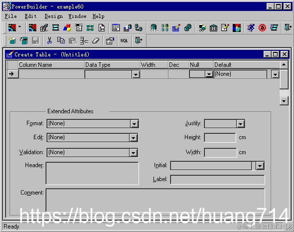 1) 单击工具条上的CREATE TABLE画板按钮,就弹出了标题为CREATE TABLE的对话框(图2-5),利用这个窗口我们就可以生成定义一张表所需要的各项信息。