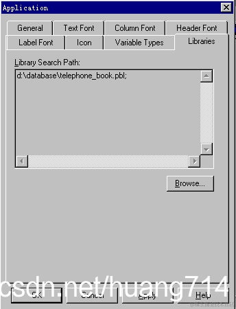 接下来为应用程序指定对象搜索路径,我们已经知道PowerBuilder应用程序中包含许多的对象,这些对象都要放在对象库中,PowerBuilder并不要求把所有的对象放在一个对象库中,而且一个应用程序可以同时引用几个对象库中的对象,这样当使用一个对象的时候就存在如何在对象库中搜索对象的问题。单击APPLICATION对话框中的LIBRARIES标签,可以在这个名为LIBRARY SEARCH PATH的编辑框中输入搜索对象库的完整路径,也可以单击BROWSE按钮,然后在系统中选中一个已存在的对象库,确定后系统就把它的路径自动放到编辑框中。应用程序在使用对象的时候系统就会按照编辑框中设置的路径依次在对象库中搜索被使用的对象,如果搜索失败将会出现系统错误。