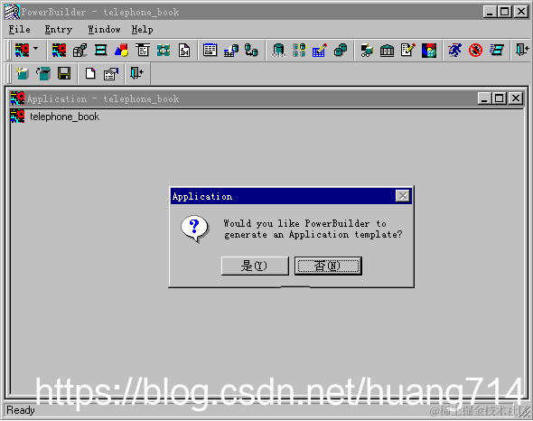4)单击OK按钮,系统就创建了一个名为TELEPHONE-BOOK的应用对象和它所在的名为TELEPHONE-BOOK.PBL的对象库。系统弹出一个对话框询问是否需要由PowerBuilder为我们生成一个应用程序的模板(图2-20),所谓应用程序的模板就是应用程序基本框架,这个框架中含有一些应用程序可能用到的基本对象,利用这个框架可以更好更快地开发应用程序。当然也可以不用这个模板而直接编写应用程序,这里选择“否”不让系统生成应用程序的基本框架,而是由我们自己一步步创建应用程序,以使你对PowerBuilder应用程序的开发过程有一个更深刻的了解。