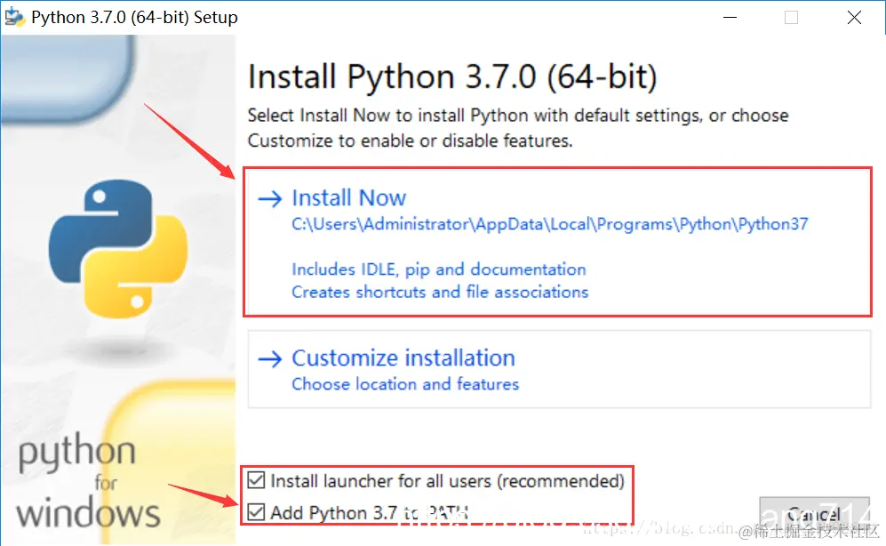 点击.exe文件进行python安装,安装步骤较简单,选择好安装路径后,记得把左下角的add to path打上勾,这样会自动帮你配置好环境变量。