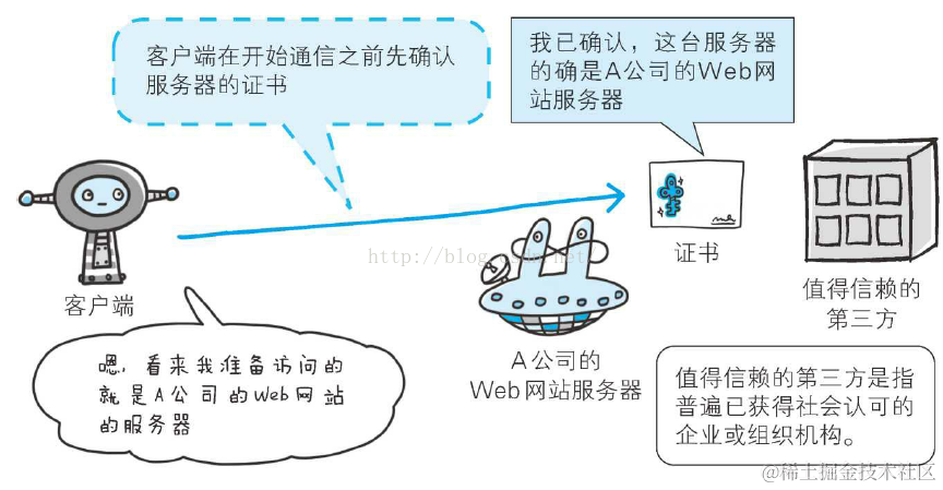 为了解决上述问题,可以使用由数字证书认证机构(CA,Certificate Authority)和其相关机关颁发的公开密钥证书。