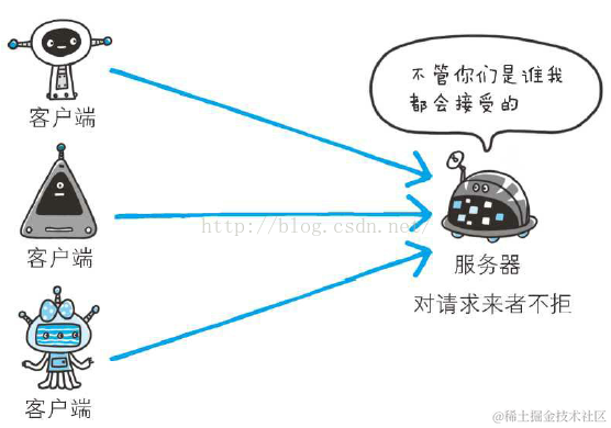 在 HTTP 协议通信时,由于不存在确认通信方的处理步骤,任何人都可以发起请求。另外,服务器只要接收到请求,不管对方是谁都会返回一个响应(但也仅限于发送端的 IP 地址和端口号没有被 Web 服务器设定限制访问的前提下)。