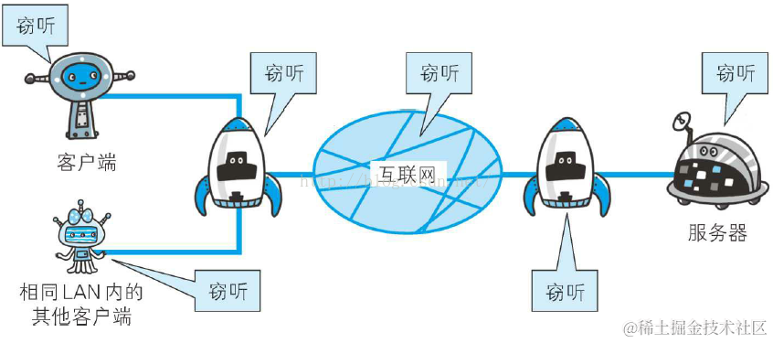 所谓互联网,是由能连通到全世界的网络组成的。无论世界哪个角落的服务器在和客户端通信时,在此通信线路上的某些网络设备 、光缆、计算机等都不可能是个人的私有物,所以不排除某个环节中会遭到恶意窥视行为。