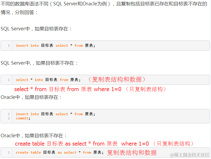 ****B:create table tab_new as select col1,col2… from tab_old definition only<仅适用于Oracle>