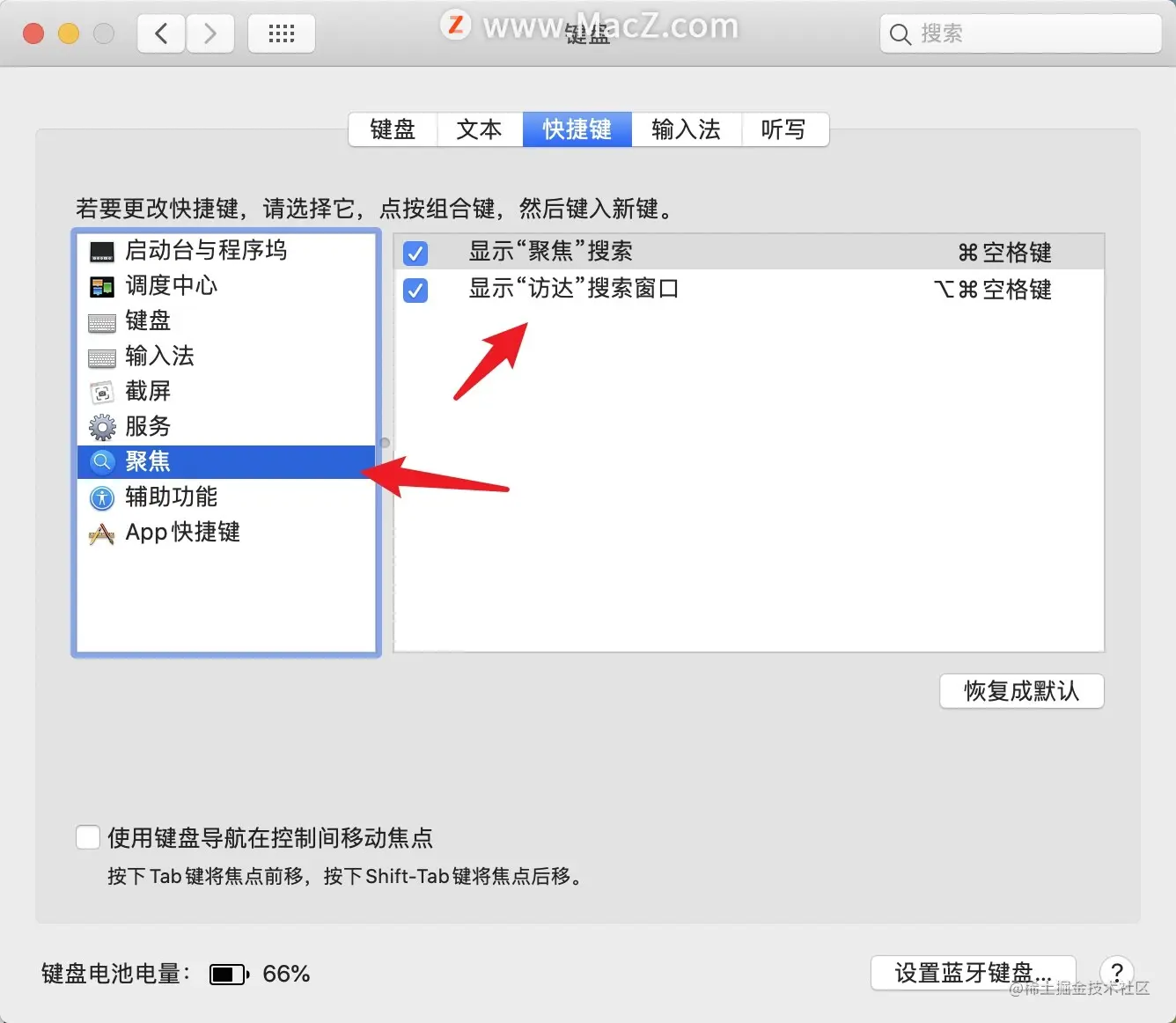 4.选择左边的“聚焦”,然后取消选择复选框或者设定新的快捷键(点按当前的快捷键,然后按下要使用的键组合)。