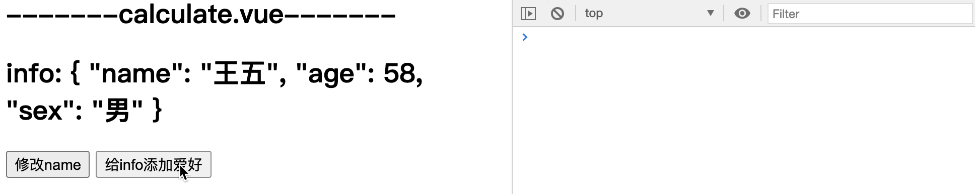 我们发现, 点击按钮添加hobby以后, 页面并没有响应式的添加hobby, 但是在右侧控制台看到$store.info中确实已经有hobby属性.