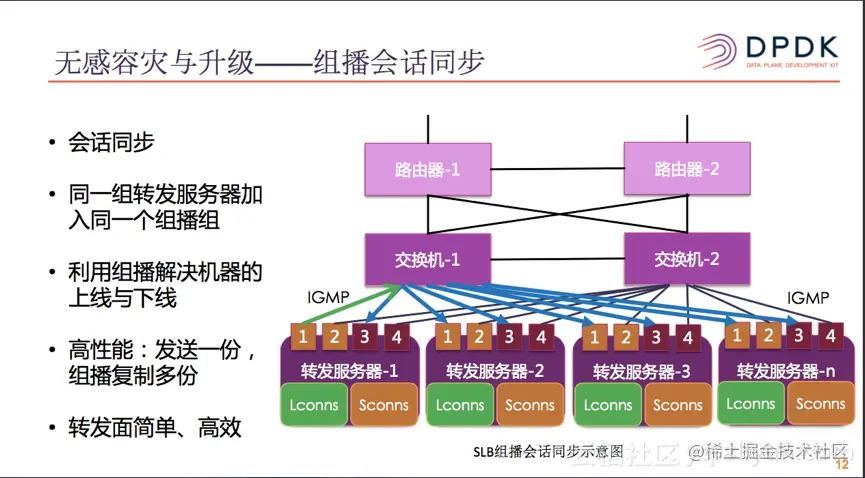 如上图,SLB采用水平扩展的集群部署,多台服务器发布相同路由,在交换机处形成ECPM路由。以达到高可用的目的。但,在连接没有同步之前,遇到服务器硬件或网络异常,会使该服务器不可用,ECPM重选路由,会使连接到达其他服务器,导致已有连接中断,造成用户访问异常。SLB使用了会话同步的机制来解决了升级与容灾场景下长连接中断的问题。用组播技术解决会话同步机制中的机器上下线问题。详细解释参见文献[1]。