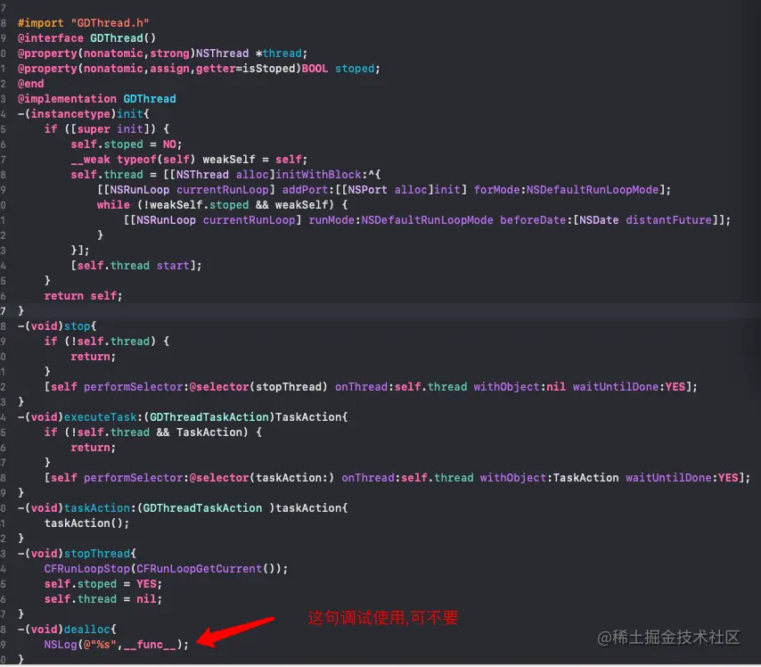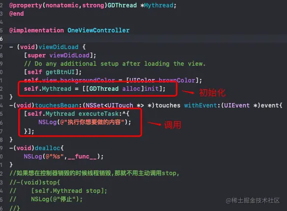 因为理论上控制器销毁了,线程也会跟着销毁,所以控制的dealloc里面应该是不用调用stop,按照这个思路我们直接在GDThread的dealloc里面调用stop方法即可,那封装的线程将变得更简单,只有2步操作即可.,初始化,调用做事!