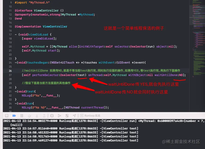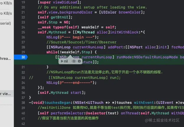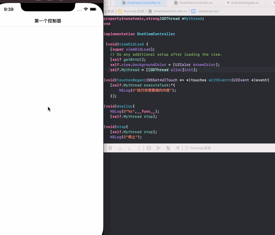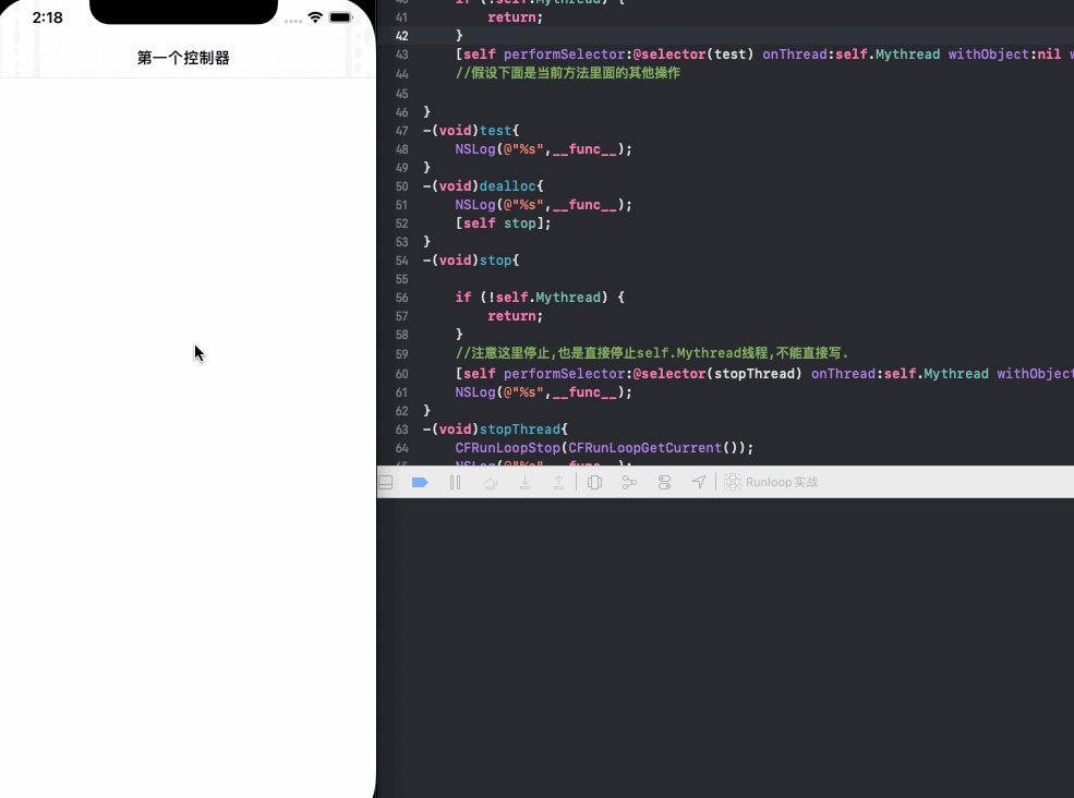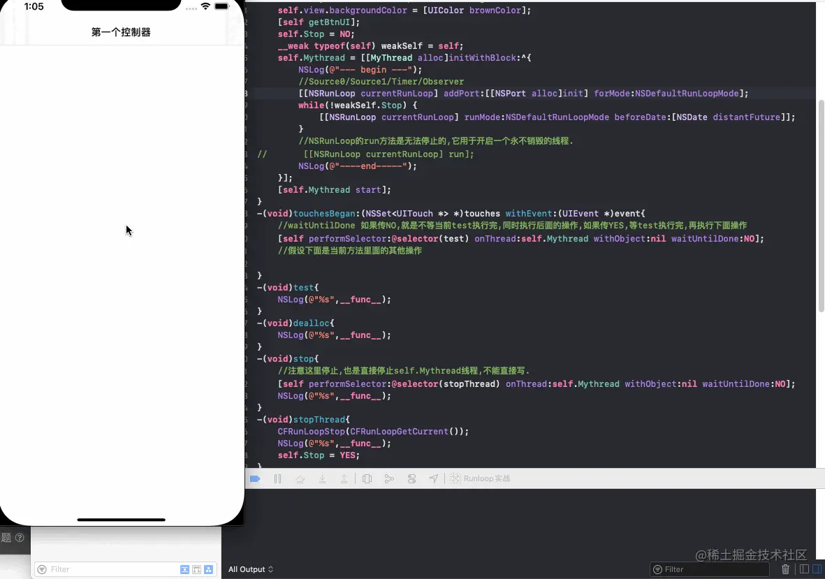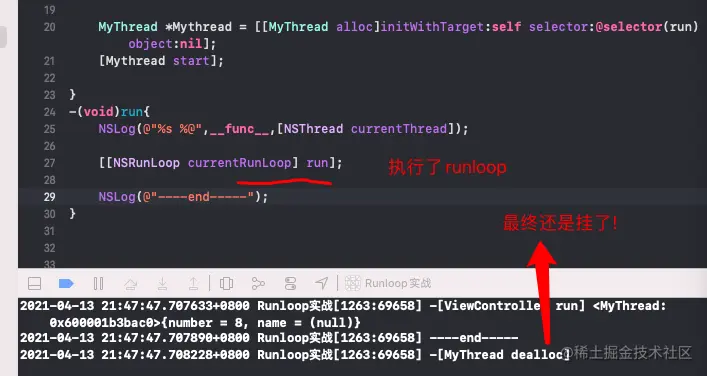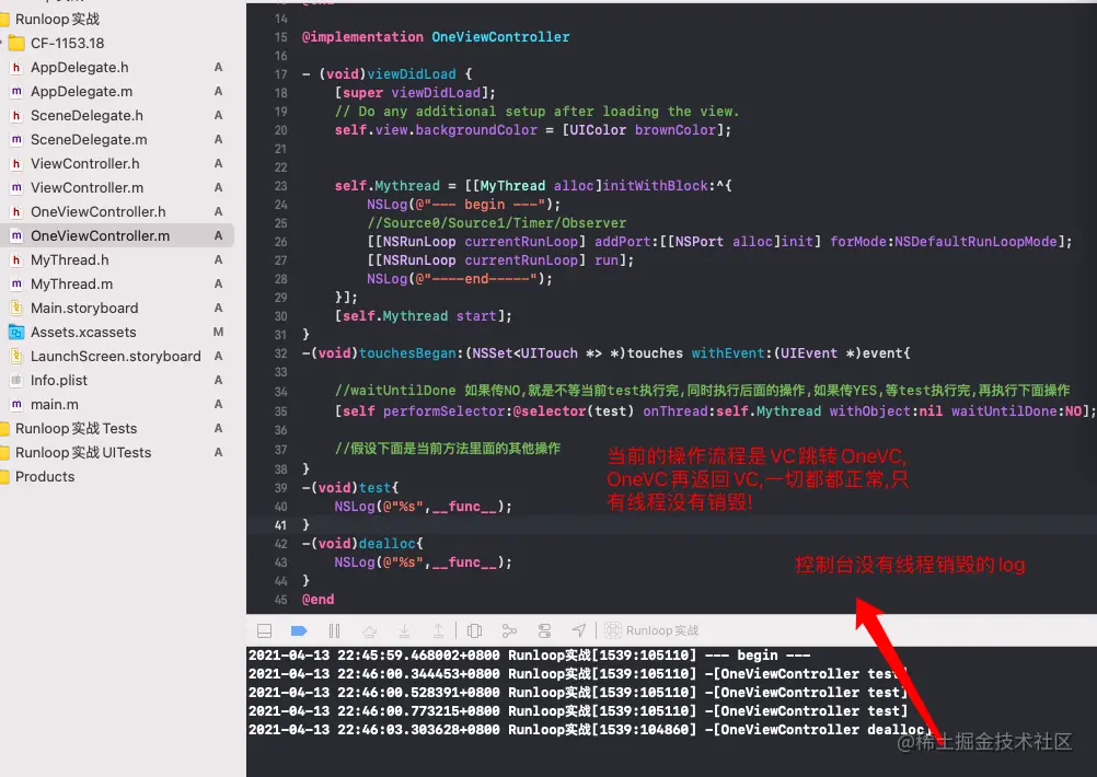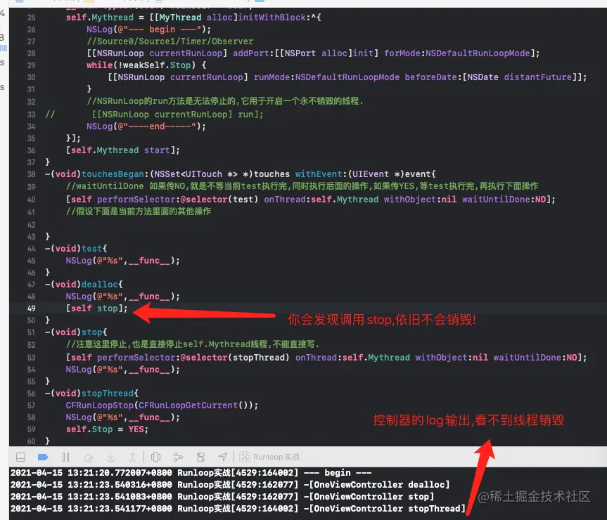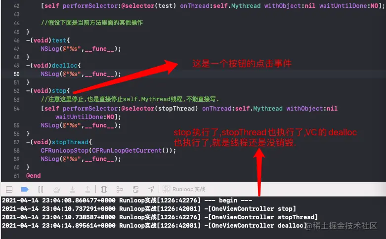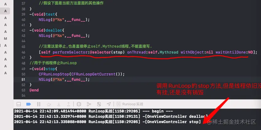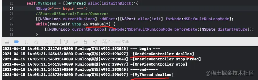 我们知道线程执行结束,线程就会销毁,只要执行NSLog(@"---- end ----"),就能让线程销毁,所以我们明显的思路就是在VC的dealloc里面停止self.MyThread线程的RunLoop.请看下面的代码.