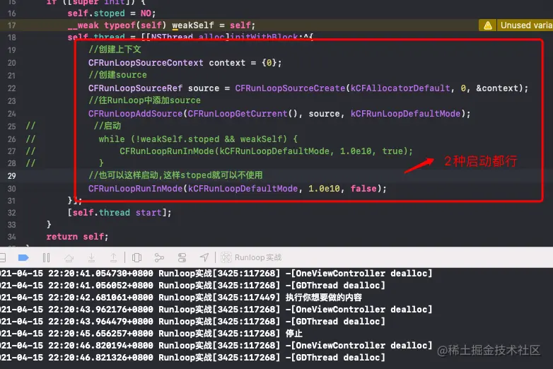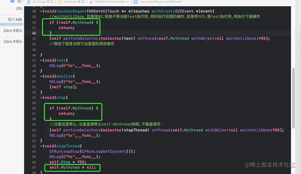 原因很简单:点击停止已经调用了stop,RunLoop已经结束了,它已经不能做事情了,只是没有销毁.你返回的时候dealloc又调用了stop,又让它去工作,肯定会出问题的.所以我们只要加一个判断即可: