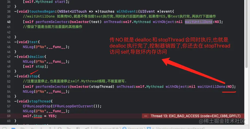 但是上面的还是不够完美,我们看看同样的代码,假如我们其他操作会不会出现什么问题,比如我们很可能不会点击停止,直接点返回,此时我们也想销毁线程,所以我们想着在VC的dealloc里面调用stop方法试试,请看下面: