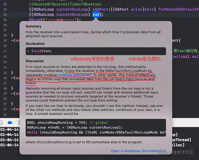 其实是这个[[NSRunLoop currentRunLoop] run];这个原因导致的,我们先看官方的解释,对于这个方法.