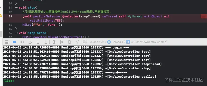 看控制台的输出,我们确实是完成了想用它就用它,不用它就让它销毁的操作,也完成了控制器销毁时候,线程也会销毁.(Stop是一个BOOL值,[NSDate distantFuture]是一个很大的值.)