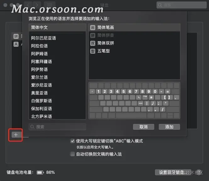 2.点按添加按钮,然后搜索语言(如“简体中文”)。如果有输入法(如手写输入),请选择一个或多个。