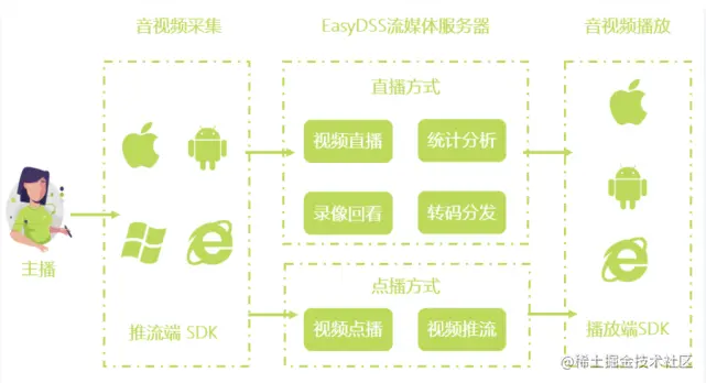 如何拥有一个支持VR的直播平台?VR直播的设备不同于传统直播,普通的手机和摄像设备无法使观众看到720度无死角的视野。我们需要借助全景相机来实现,全景相机通常有两个或更多个镜头,能够同时拍摄各个角度的事物,并借助内嵌的算法来完成拼接,最终才能实现我们所看到的VR直播画面。将全景相机的拍摄画面通过4G/5G/专线将视频推流到EasyDSS系统,然后通过公有云的CDN云分发,就可以实现终端直播浏览。