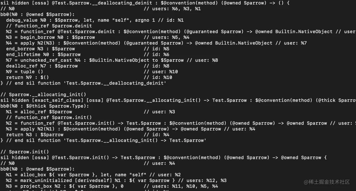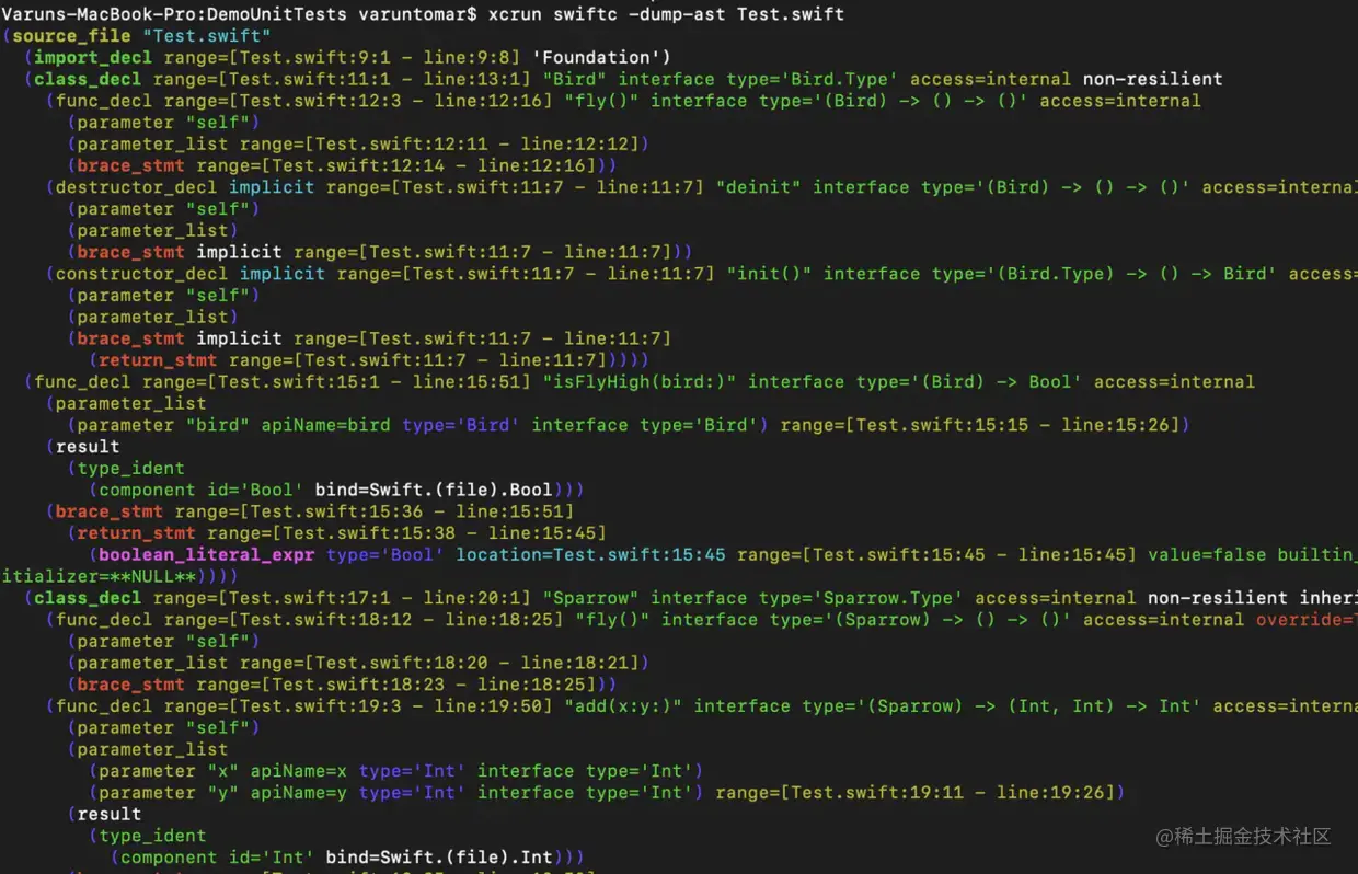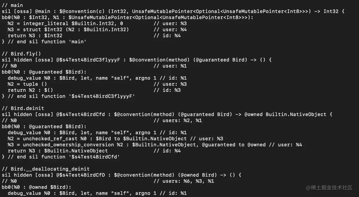 看到这些终端输出的SIL生成内容,你可能会发出这样的惊讶:"OMG😮。@$s4Test4BirdC3flyyyF是个什么鬼东西?"。别担心,这没你想的那么可怕,它只是一种名称混淆,用于将实体的附加信息压缩到单个字符中。这个处理过的名称包含了一些类型(class/struct/enum)、module、上下文等信息。例如,在@$s4Test4BirdC3flyyyF中,Bird后面的字母C表示Bird是一个class。它还可以表达很多东西,但这不是本文的重点。如果你对它有兴趣,可以在反馈部分添加评论。此外我们可以使用swift-demangle追溯一个混淆的字符串直到它最初可读的文本样式。