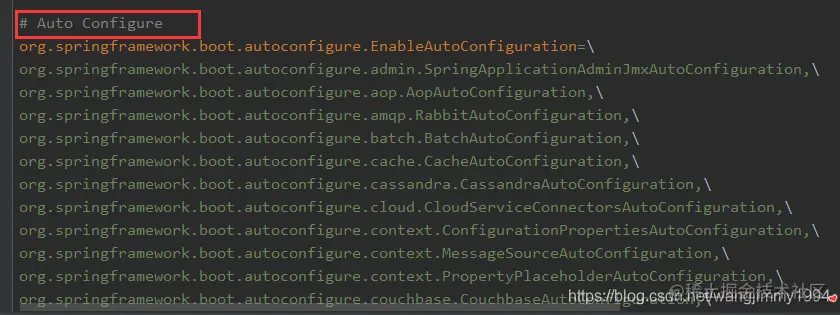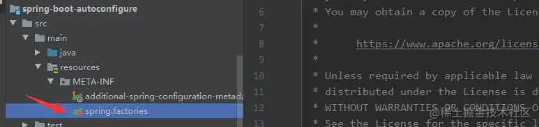那我们就找一下这个路径,去哪里找呢,我们看到这个类的包是org.springframework.boot.autoconfigure;那我们就到这个包的位置去找这个spring.factories,果不其然,我们点开这个文件