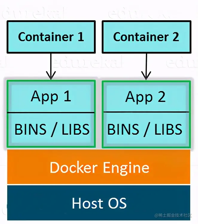 在上图中,您可以看到存在一个由所有容器共享的主机操作系统。容器仅包含特定于应用程序的库,这些库对于每个容器都是独立的,并且它们速度更快且不会浪费任何资源。 所有这些容器均由非主机操作系统固有的容器化层处理。因此,需要一个软件,该软件可以使您在主机操作系统上创建和运行容器。 现在,让我来介绍Docker。