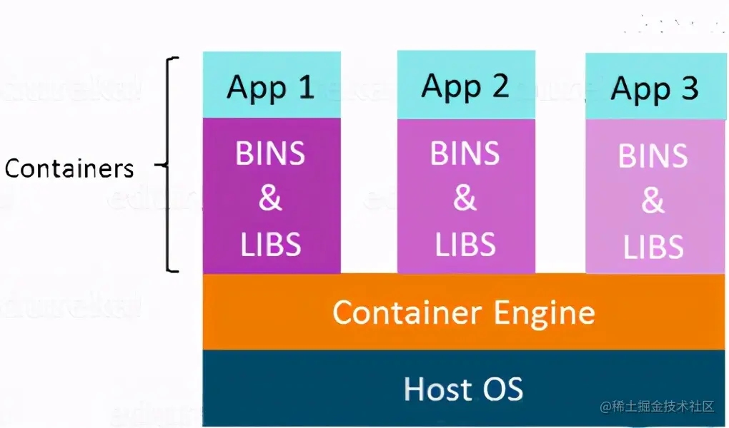 在上图中,您可以看到有一个主机操作系统,在该主机操作系统上正在运行 3 个来宾操作系统,这些操作系统只是虚拟机。 如您所知,没有什么是完美的,虚拟化也有一些缺点。在同一主机操作系统中运行多个虚拟机会导致性能下降。这是因为来宾操作系统在主机操作系统之上运行,该操作系统将具有自己的内核以及一组库和依赖项。这占用了大量系统资源,即硬盘、处理器、尤其是 RAM。 使用虚拟化技术的虚拟机的另一个问题是启动需要花费近一分钟的时间。对于实时应用程序,这是非常关键的。 以下是虚拟化的缺点: