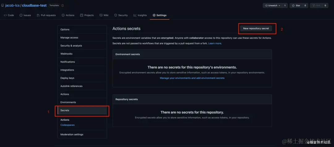 既然不能上传的话,我们应该如何配置呢,答案很简单,使用 GitHub secret 即可。需要在 腾讯云控制台 新建秘钥,新建完成后,打开你的 GitHub 仓库进行如下设置: