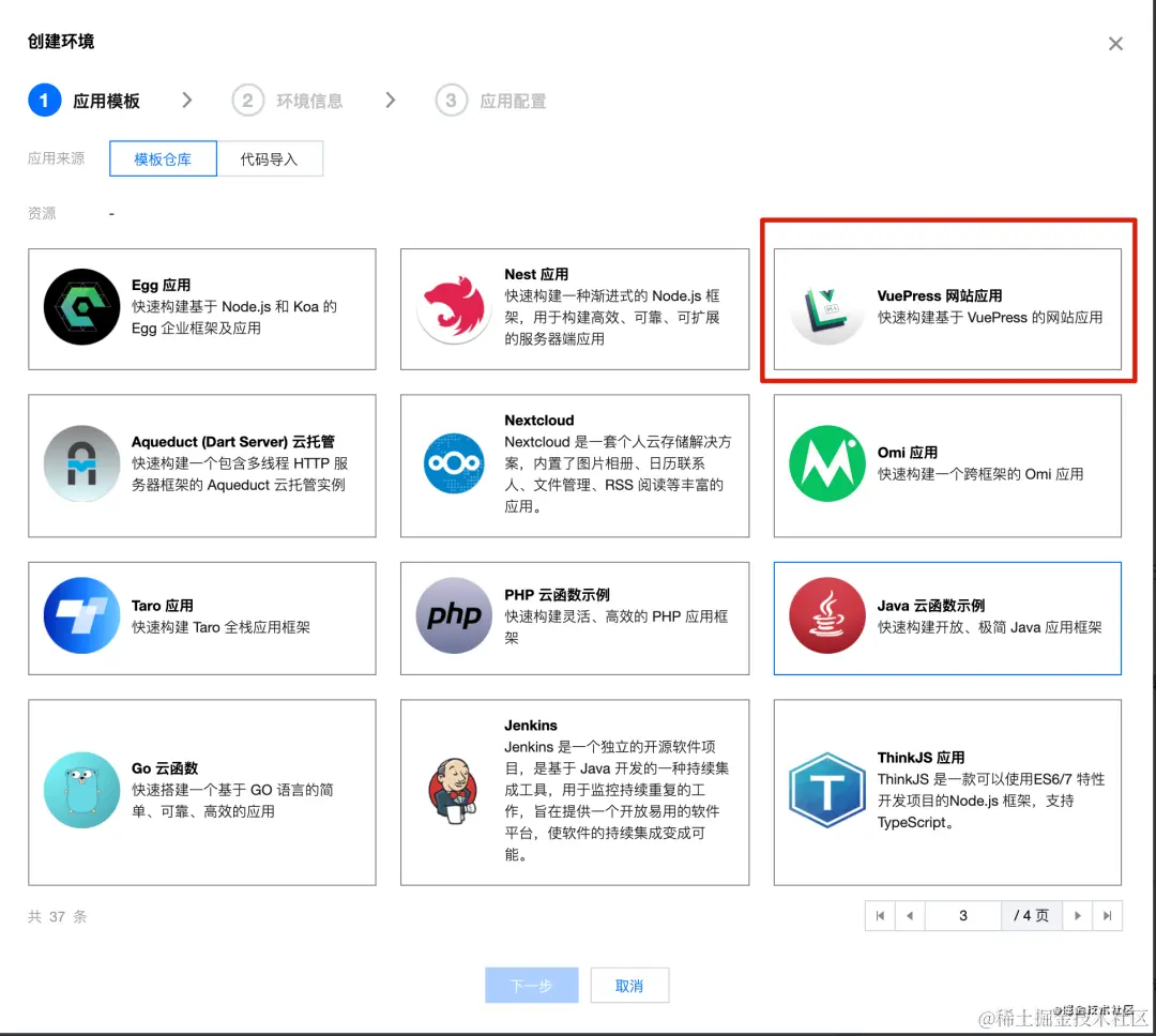 接下来会选择关联环境,如果你当前没有环境的话可直接选择「创建新环境」,CLI 会自动打开浏览器跳转到「创建新环境」页面,创建新环境如下图,在这里我选择使用 VuePress 模板进行创建: