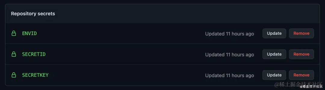 创建 ENVID、SECRETID、SECRETKEY 三条 secret,其中 ENVID 在 应用列表中可见,配置完成后如下所示: