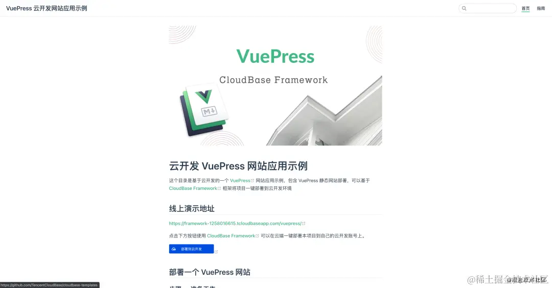 执行 npm run deploy 稍等片刻之后即可部署成功,命令行会返回一个访问域名,笔者的为:cloudbase-test-9gccjnk3e393c02a-1256377994.tcloudbaseapp.com/vuepress/ ,点击即可访问示例网站,如下: